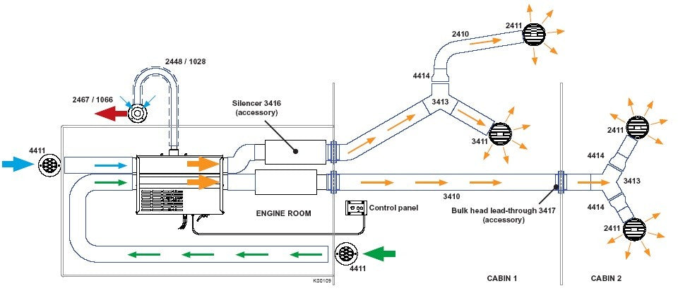 Heated air is distributed through the boat with 3410 ø 75mm duct. Multiple outlets can be installed by adding 3413 ø 75mm “Y” fittings leading to various locations.