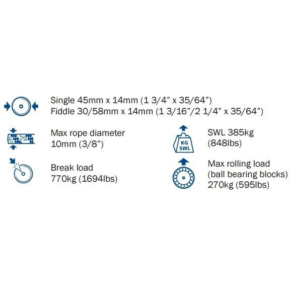 A strong, lightweight block for use on dinghies, day boats and light cruising yachts. Ideal for mainsheet, vang, lead blocks or wherever a powerful and compact purchase tackle is required. A comprehensive range of cam cleat, fiddle and fiddle & cam cleat versions are available.